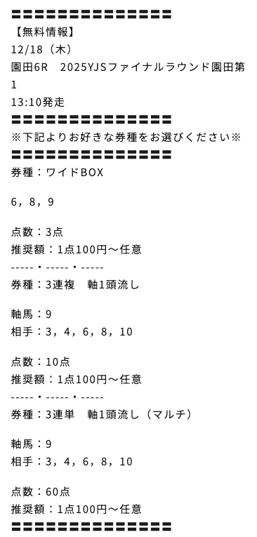 - 公開時間:当日の12時半(地方競馬)