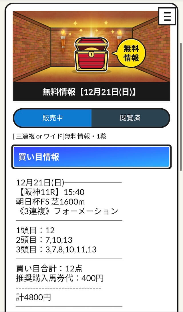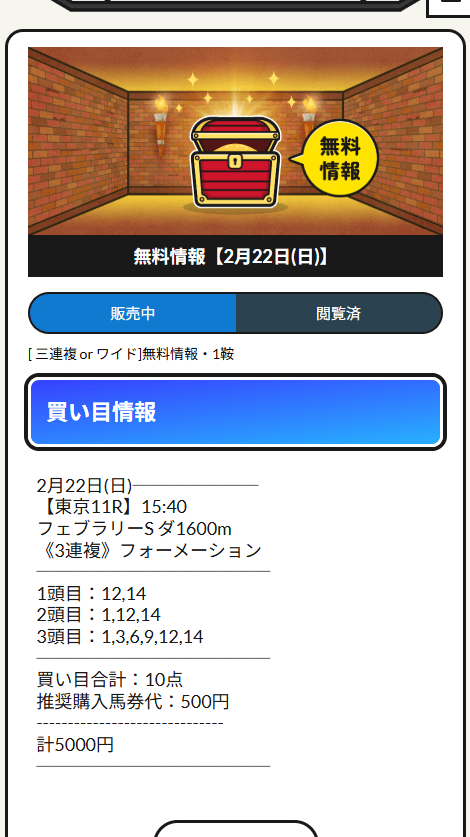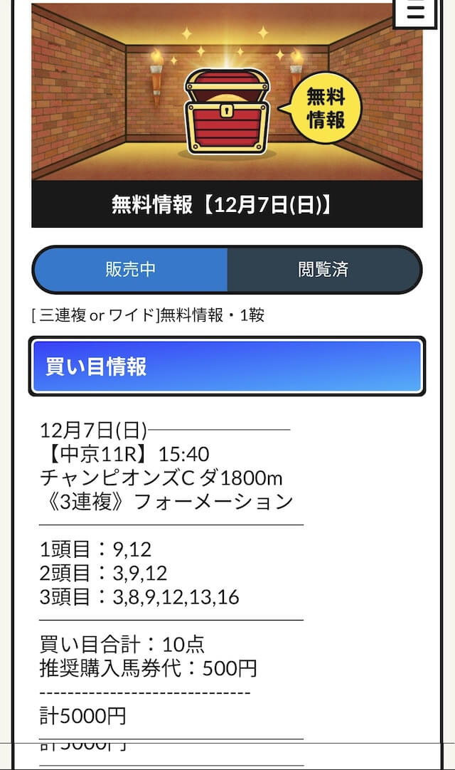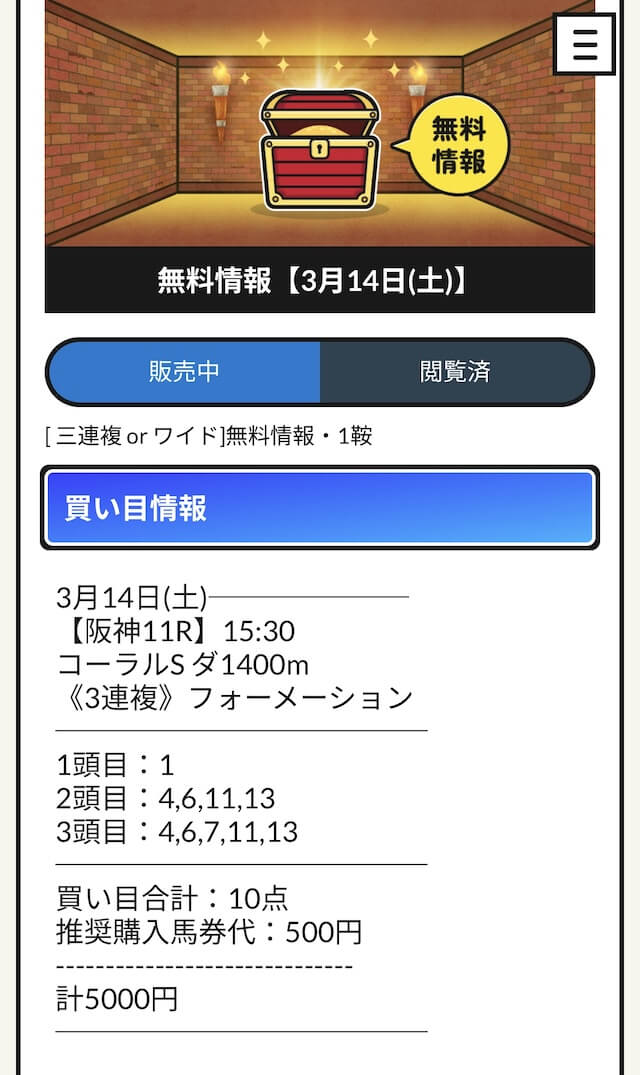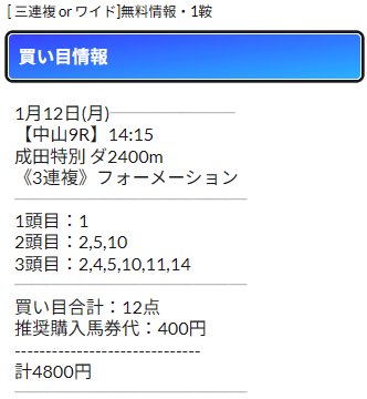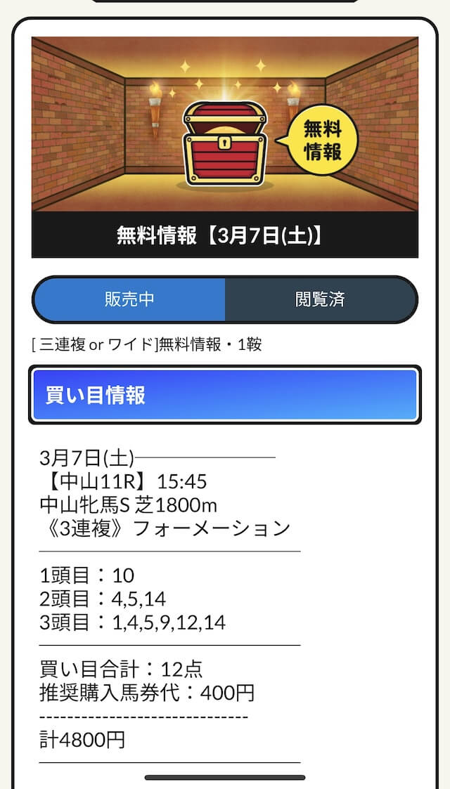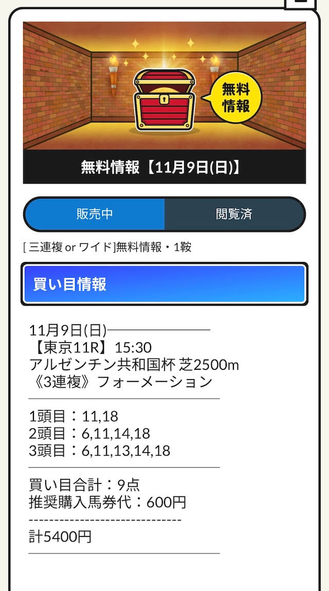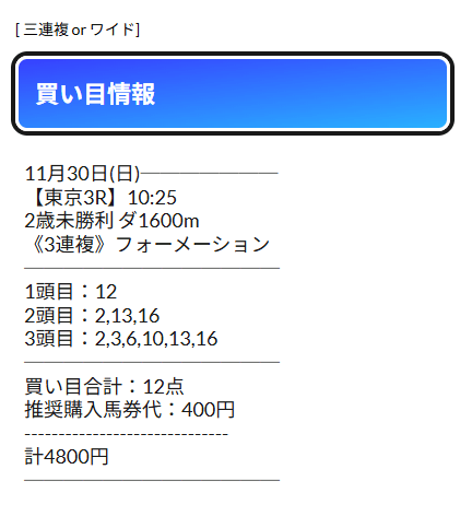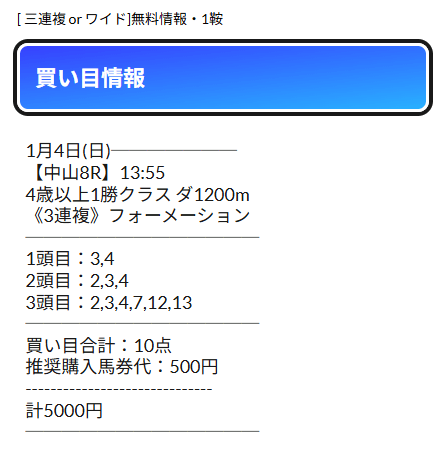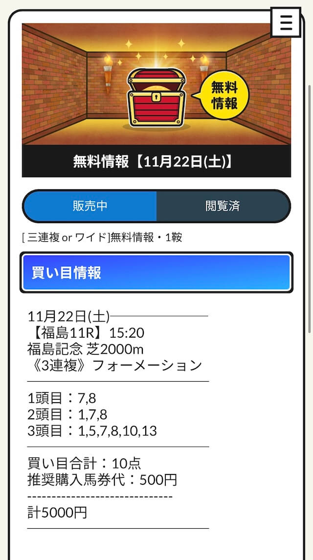 公開されるのはワイドと三連複の予想の2種類で、レースによって使い分けているようです。