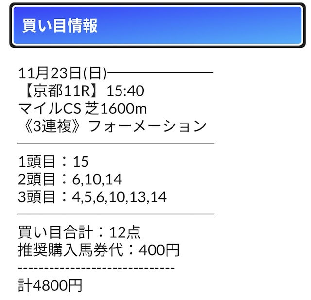 特に、2023年3月26日に開催された中京11Rでは、12番人気と13番人気が馬券内に入る大荒れの展開でしたが、見事読み切り405,900円を獲得!