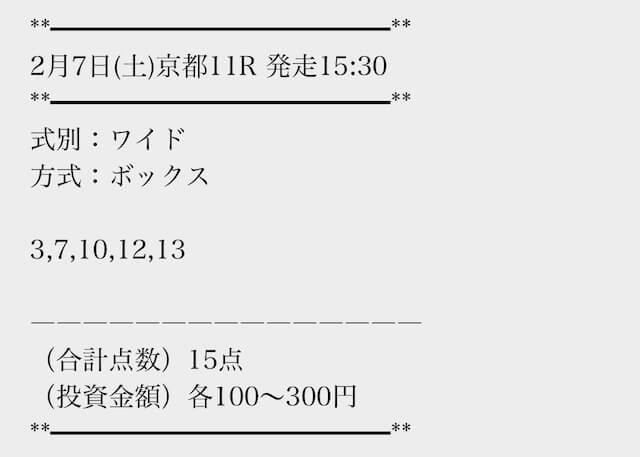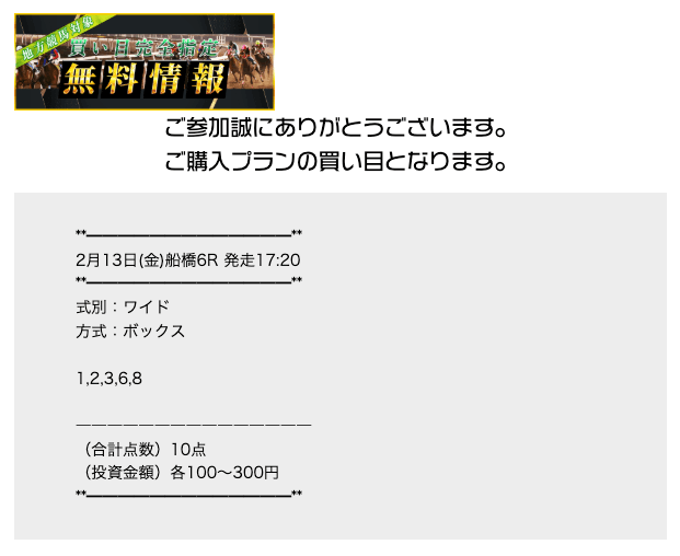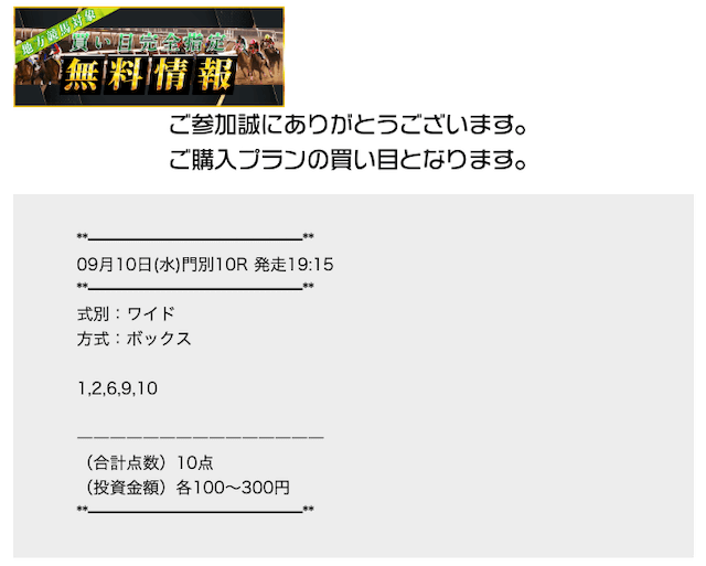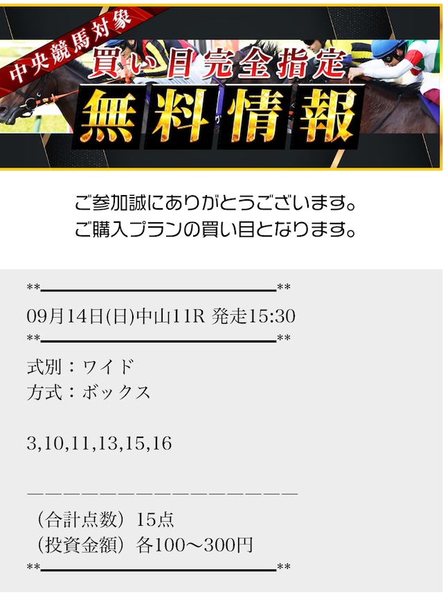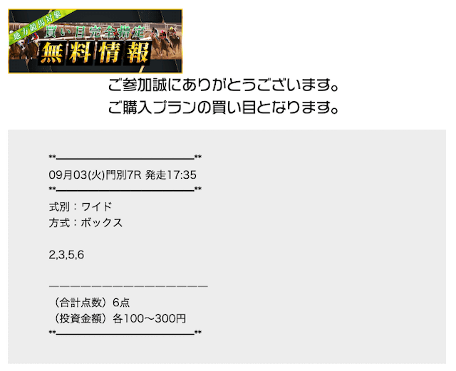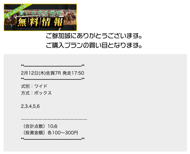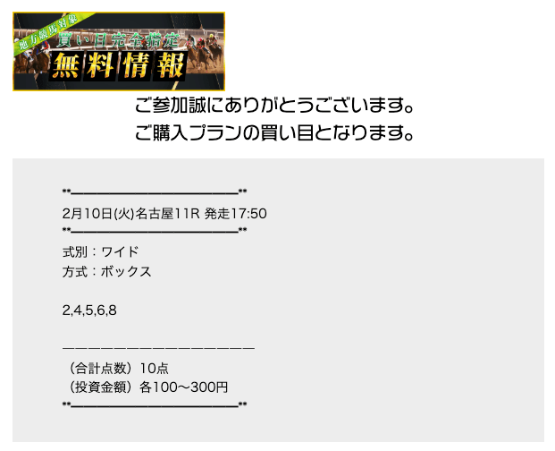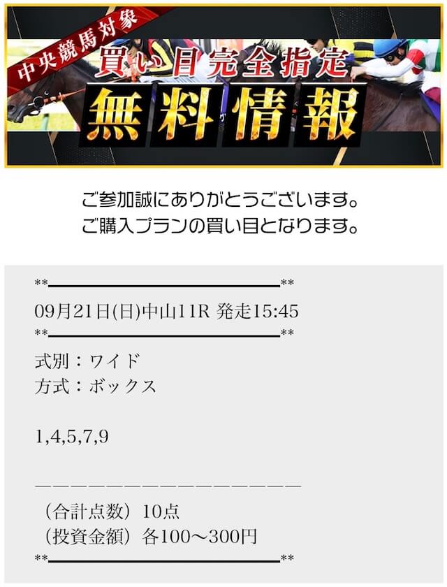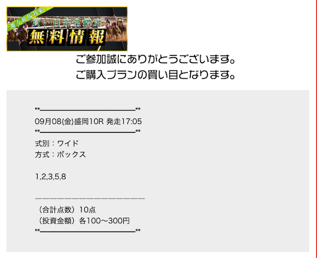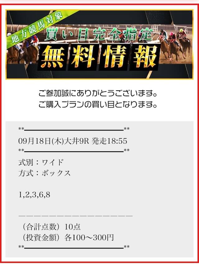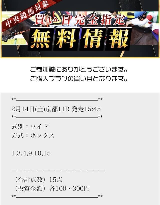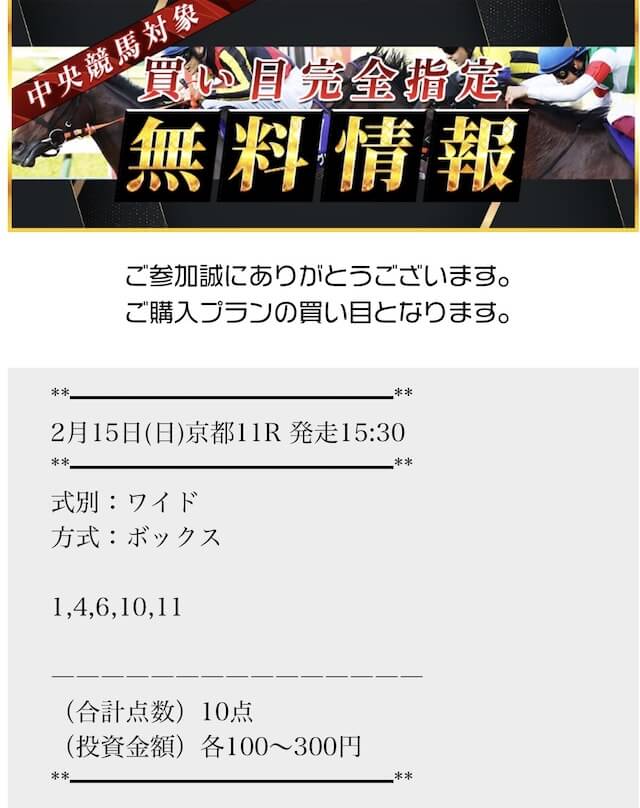 確実に当たるということはないんだけどそれにしても的中率の高さには驚いています。なんでこんなに当たるんですか?って感じで情報の質の高さがとにかく売りなんでしょうね。ただ、反面情報料金がちょっと高いのは気になるところではありますが..