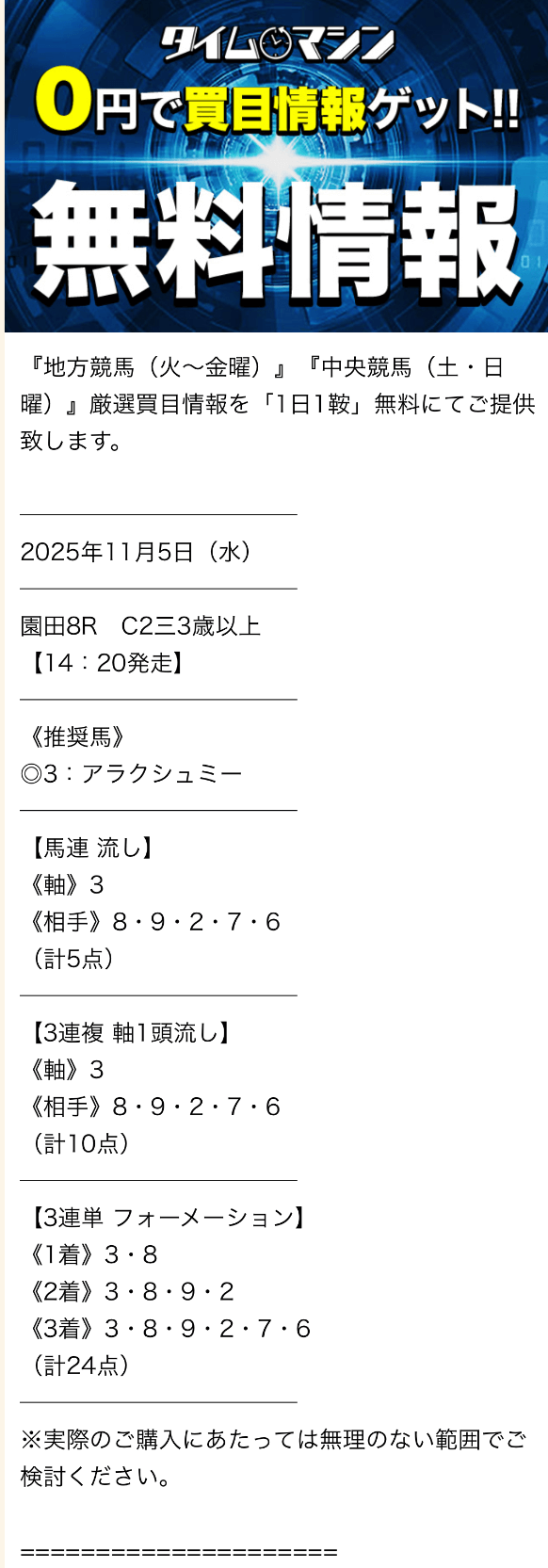 目安の軍資金が貯まったら、ニジュウマルの無料予想に移行してください。