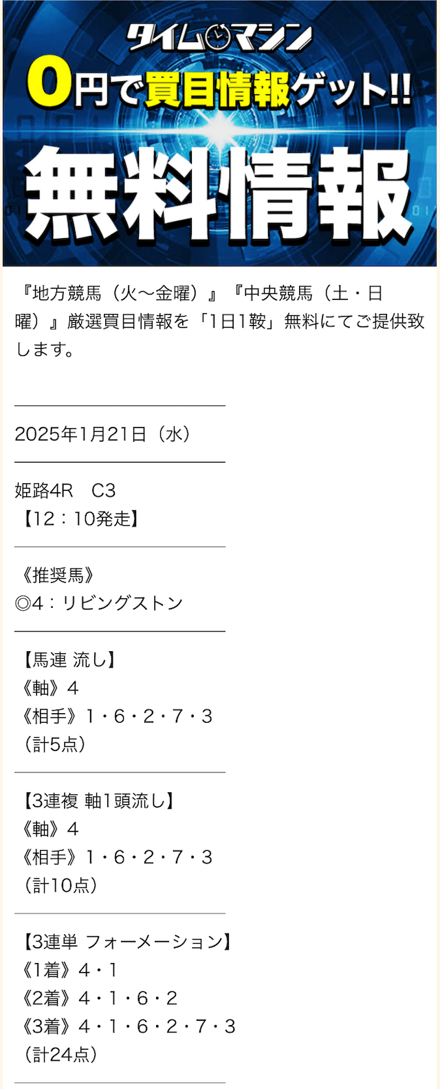 タイムマシンは、少ない投資額で高額な馬券を的中させる競馬予想サイト。