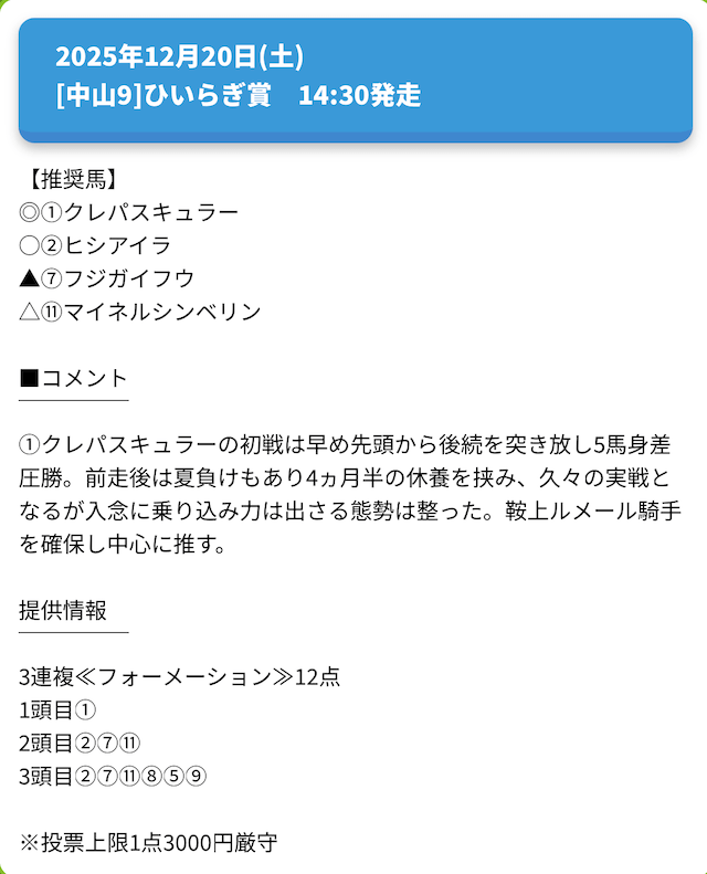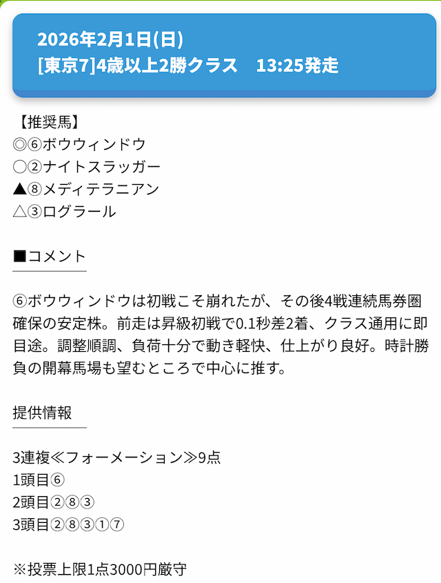 推奨馬券代は、上限1点3,000円としか記載されていなかったので、今回は1点1,000円で購入し計9,000円で勝負していきます。