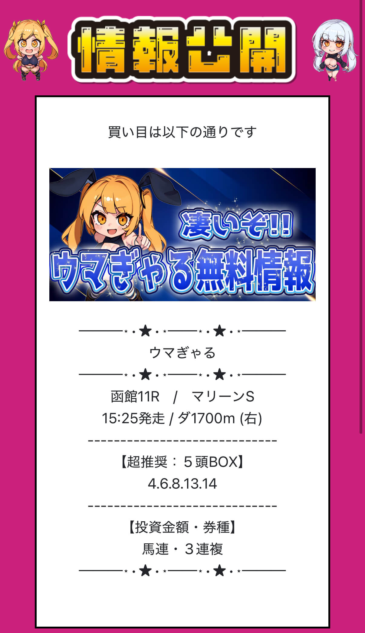 ウマぎゃるは具体的な買い目を公開するのではなく、狙い目な馬を3頭紹介するスタイル。