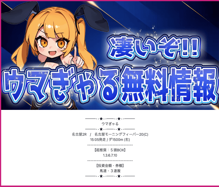 サイト自体かわいい見た目だから少し侮ってたが、中々どうして情報は良い意味でかわいくないね(笑)高配当的中ありがとう(^^)