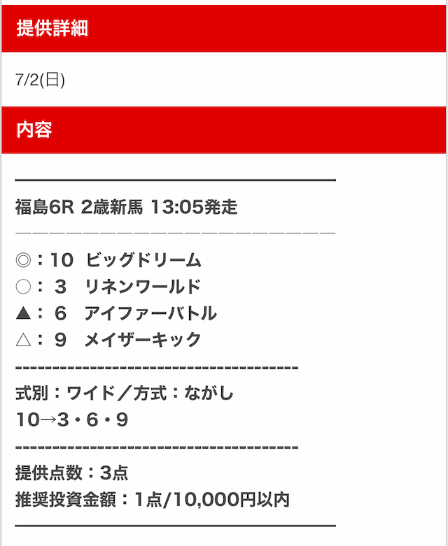 推奨金通りに購入すると馬券代が3万円と高額になります。初めは参加するかかなり悩んでしまいました。ただ的中率・回収率ともに優れているので1レース的中すれば、数レース分の参加費用を賄えることができるので問題なし。それでも不安に感じる人は1点1,000円から賭けてみても良いかも。