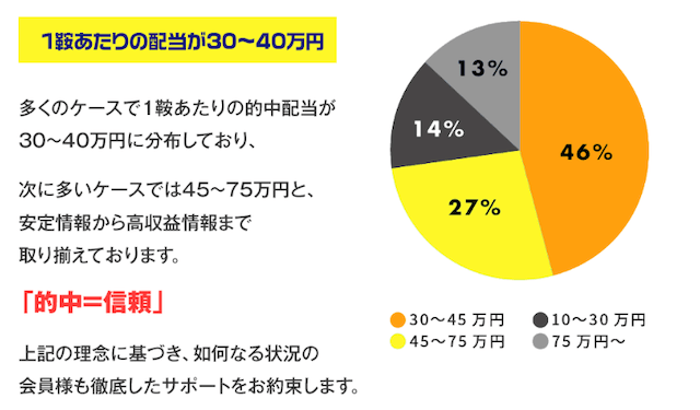 最初に無料予想で連勝したから期待しましたが、週によっては外れます。特に連敗した時は、軍資金があっという間に減ってしまい、精神的にもきつかったです。的中率が66%というのは、3回に1回は外れるということ。当たった時に高配当を得られないと、すぐにマイナスに転落します。「的中=信頼」というモットーを掲げている割には、もう少し安定してほしいです。当たる週と外れる週の波が大きいと感じたので、利用を一旦停止しました。