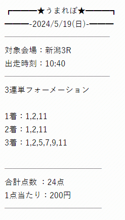 投資金額に関しては、的中時の利益を増やしたいので、1点1,000円で勝負。
