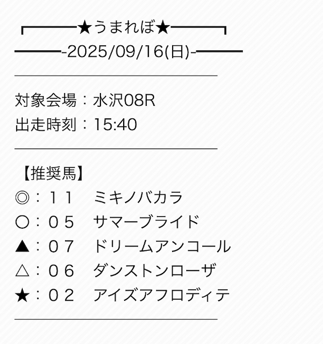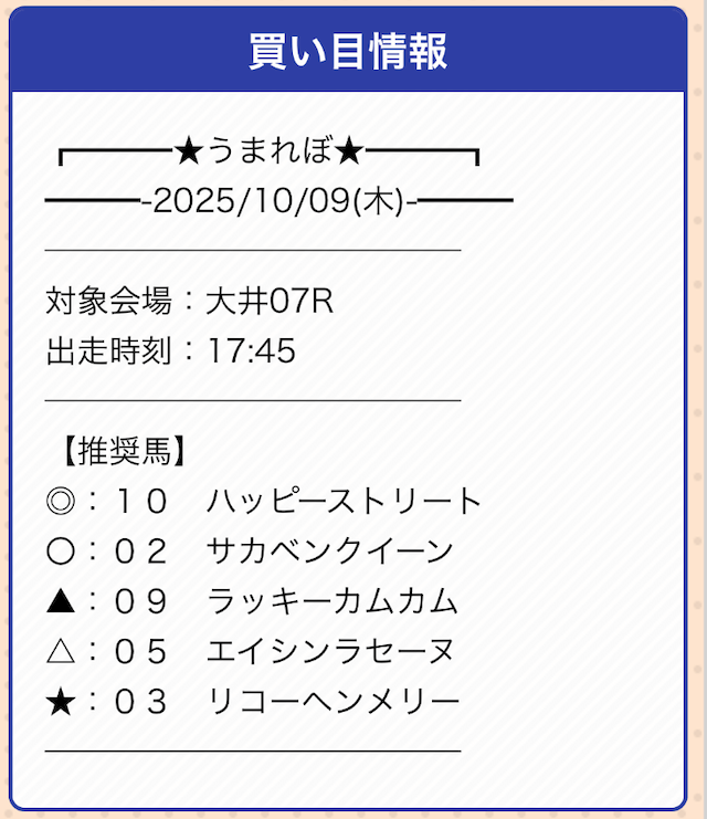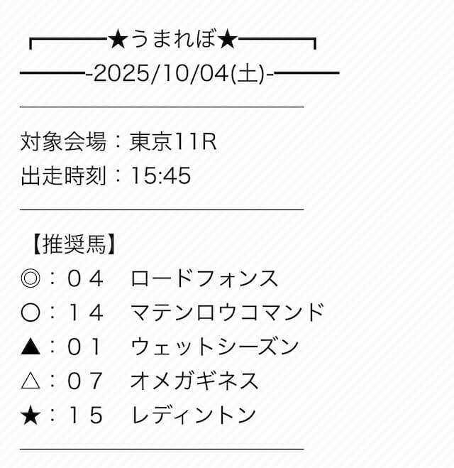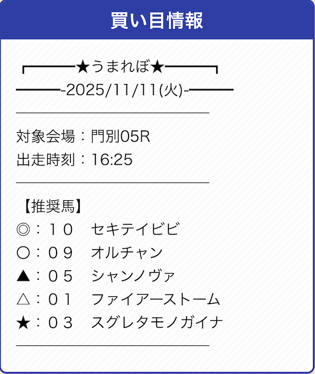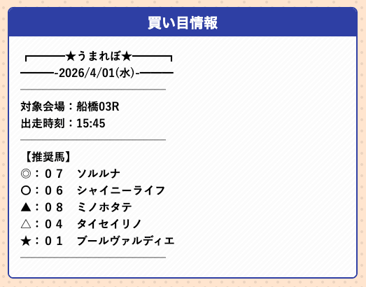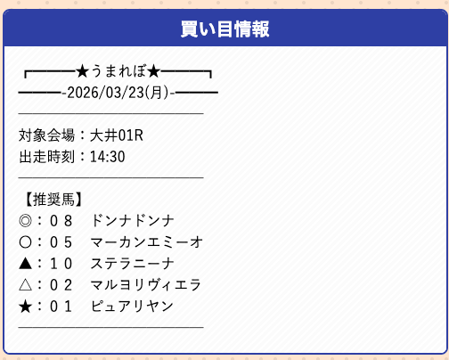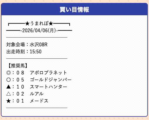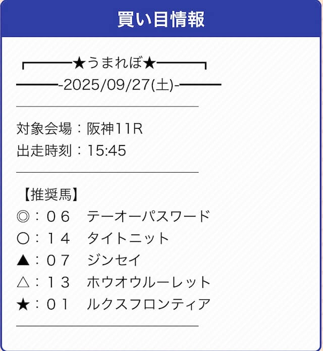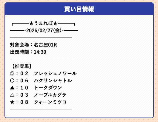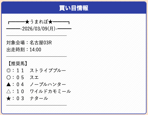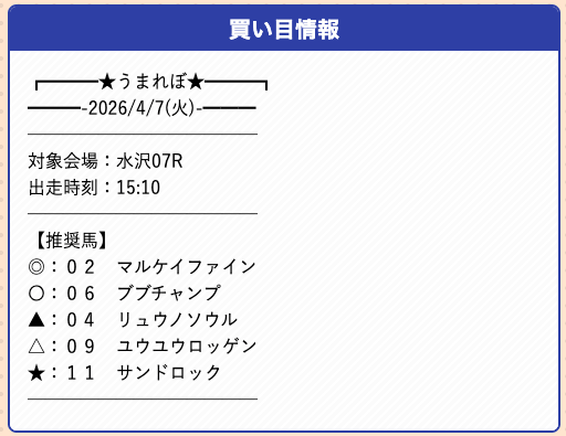 うまれぼの無料予想は、推奨馬を予想印で公開するサイトで、券種や投資金額の指定はありません。