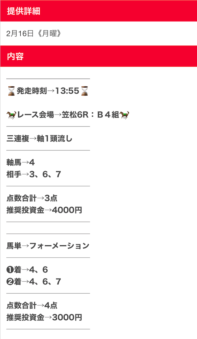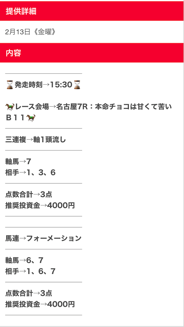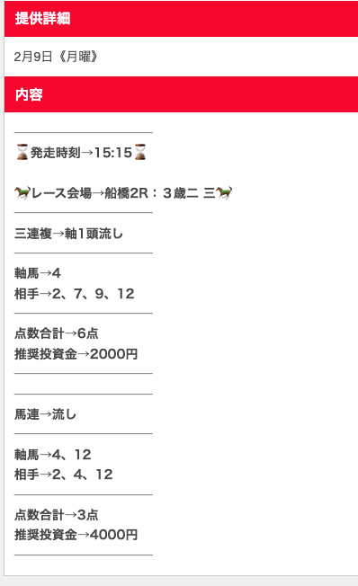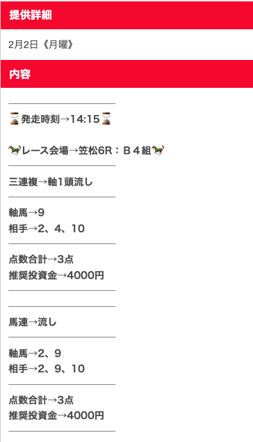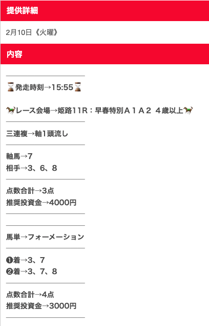 無料予想、確かに当たるんですけど、記事の口コミにもあった通り1点2,000円とか指定されると心臓に悪いので、勝手に500円にして買っています。それでも十分プラスになるので満足ですが、推奨通り買える度胸がある人が羨ましい。予想精度自体は文句なしの☆5ですが、心臓に悪いので☆4で。