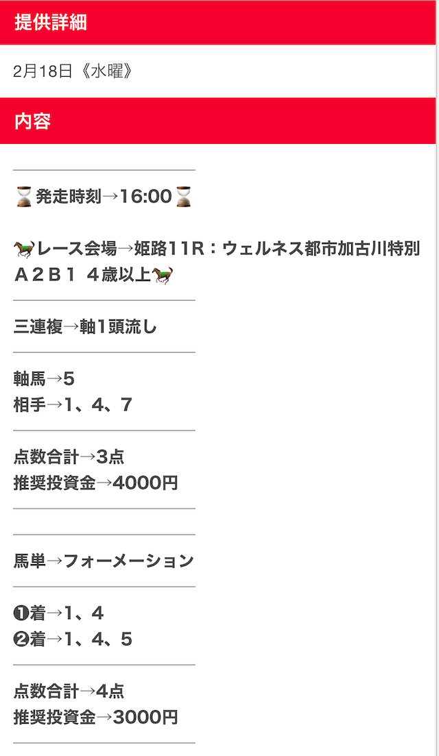 登録特典のポイントが少し余っていたので、プランではなく単発の「ポイント情報」を使ってみました。おまけ程度に考えていたら、しっかり万馬券が的中。メインの有料プラン以外も手を抜いていないのが分かって、サイト全体の信頼度が上がりました。