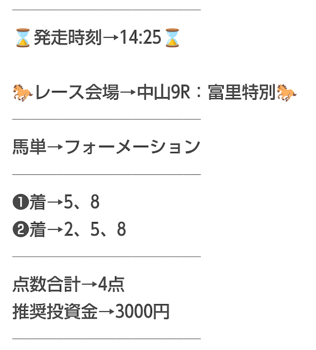 難しい操作がなく、LINEでポチポチするだけで予想が見れるのが良いです。無料予想で軍資金5万円があっという間に10万円以上に増えました。推奨金額が高めなので最初はビビって半額で買ってましたが、今は全額ベットしてます。今のところ負けなしです!