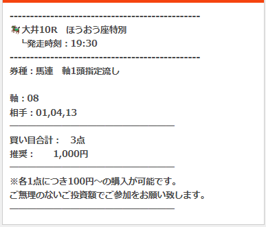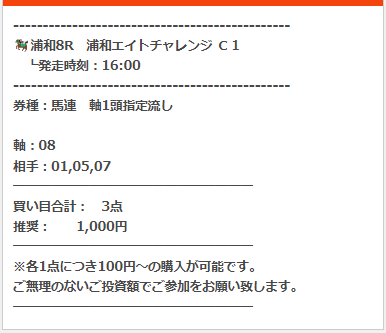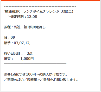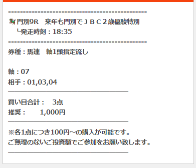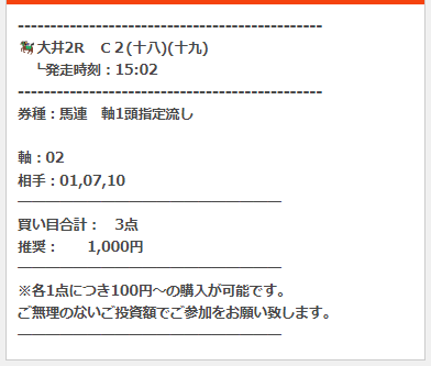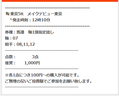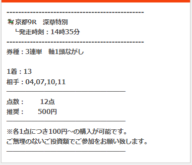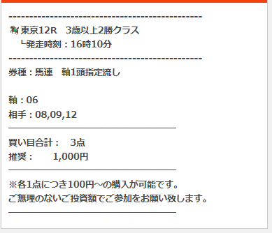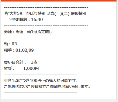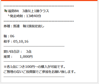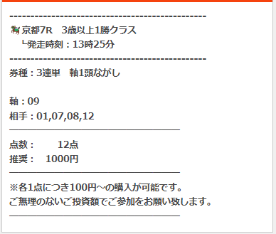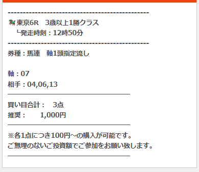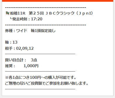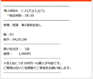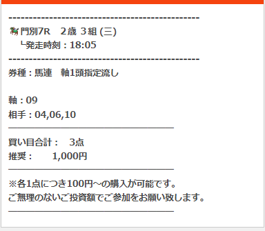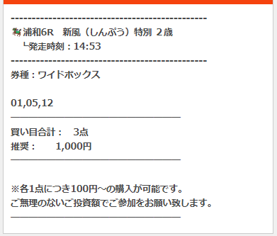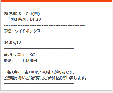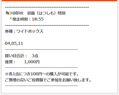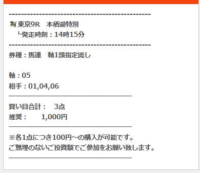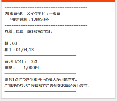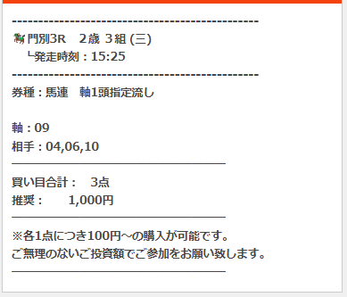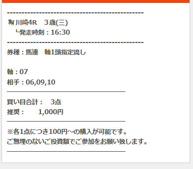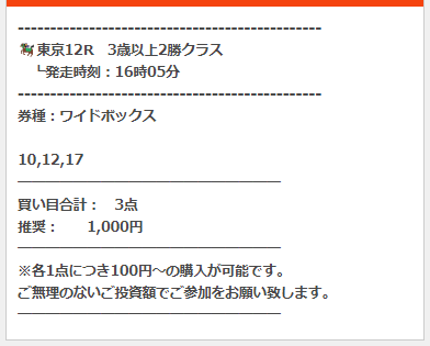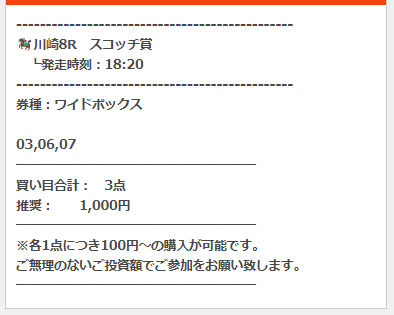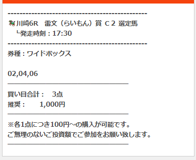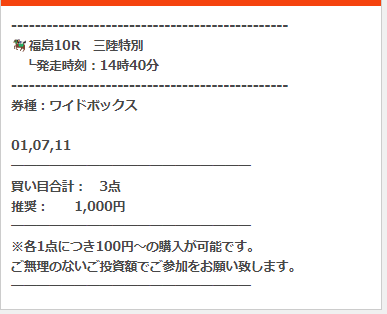 予想の券種は、単勝・複勝・ワイド・馬連・3連複のいずれかランダムで公開されます。