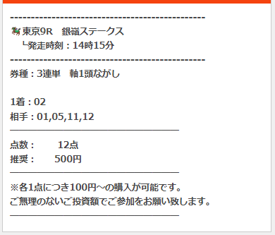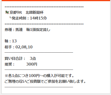うま遊勝は、複数の券種で無料予想を公開していますが、自分は配当に期待できる3連複をメインに参加させていただきました。