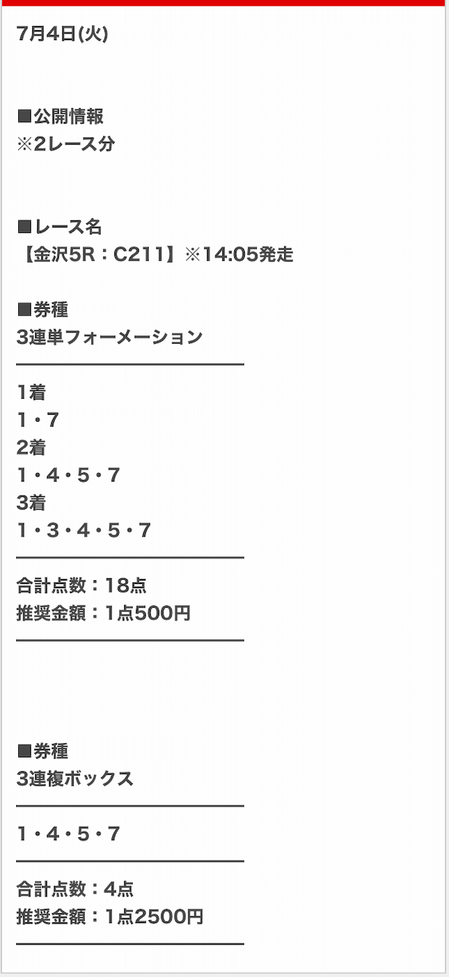 個人的に最も魅力に感じるには・・・買い目点数の少なさかな。しっかりと軸を固定した「ながし」で勝負できるからこその小数点勝負!予想精度は文句なし!投資金額を下げて自分の予想の保険代わりに参加することもできるし使い勝手が良すぎるよ。