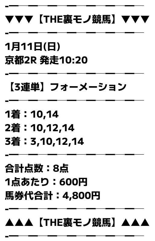 投資金馬券代 4,800円情報料 300,000円獲得金額 +2,668,470円 - 中央禁書2026/01/11