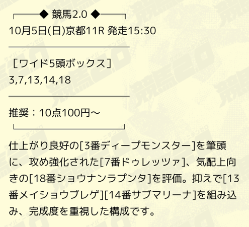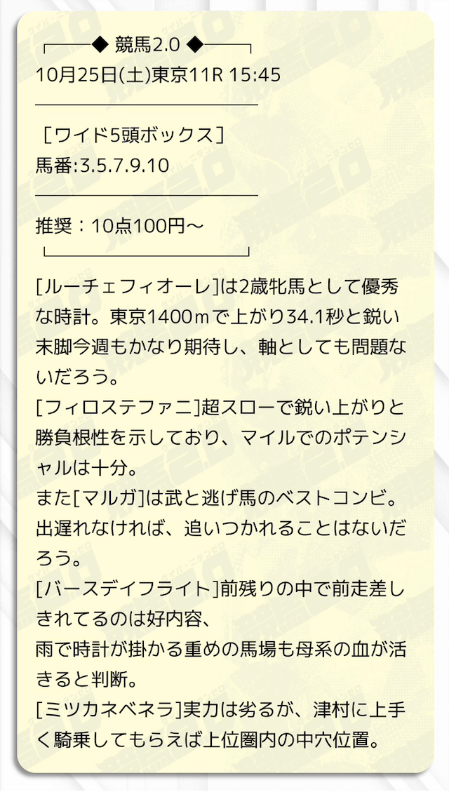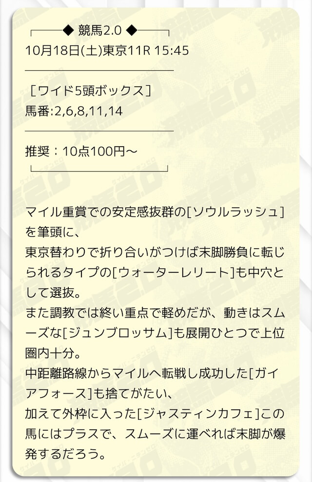 自分じゃ絶対買えない穴馬をしっかり押さえられててこれでこそ、金を払ってもらう価値のある予想だよなと納得。