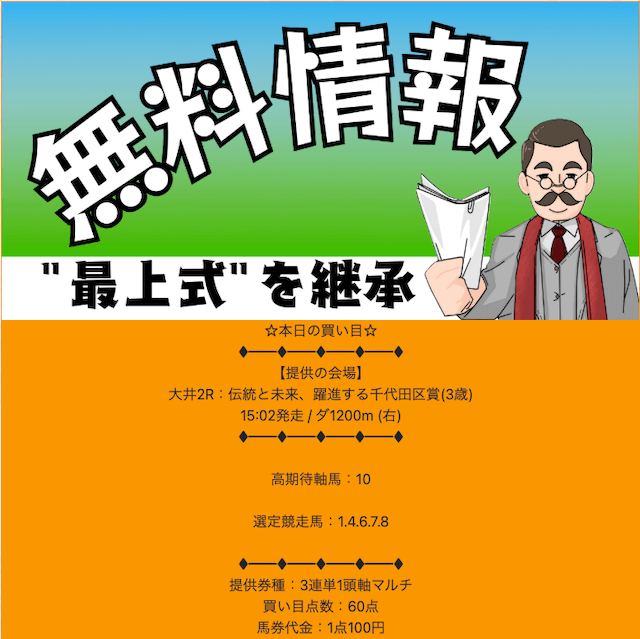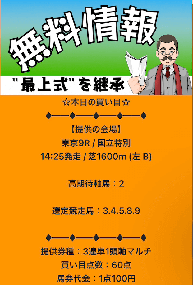登録後は無料情報で様子見るよりも不的中だった時の特別提供か初回プランのプレデターが良いぞ。自分は無料で稼ごうと思ってたらいつの間にか初回の権利無くなってた💦